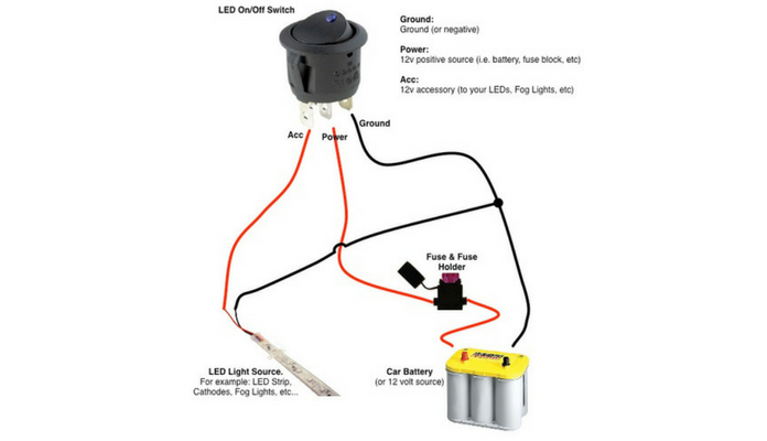 that is why. its a 10 amp fuse. these led’s draw SOO little. you NEED a 3 amp fuse.. if possible i’d even try to get a 1.5A i agree with bad venge. you have a short from how you wired the switch :/. get a MUCH smaller fuse and try it.. i bet it’ll pop. :/ for the switch.. only ONE line is ground… make sure you get that right (the ones I have are all on the led side like the image shows). the middle line is power IN. so from battery—-(wire)—–|3A fuse|—-(wire)——- {Middle line on switch}. from that last spot on the switch goes to your positive lead to the leds (red wire to led’s). |
