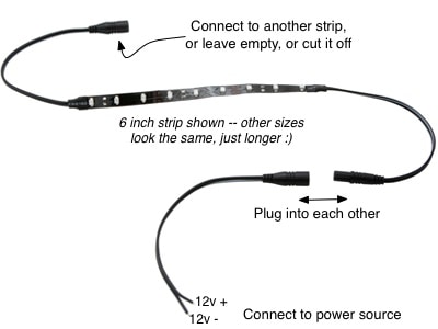 Need to make it shorter? They can be cut every few inches (or between every 3rd LED). The all-black circuit board offers an elegant aesthetic, especially for installations where the strip may be directly visible. Each end has pre-attached power wires. You only have to hook up one end. The other may be used to extend the strip. Simply plug another one in! Hook the wires up to your 12V power source. One is indicated with a white stripe, for positive, and the other is all black for negative. You can easily connect multiple strips of any length together by plugging them in together with the quick disconnects.