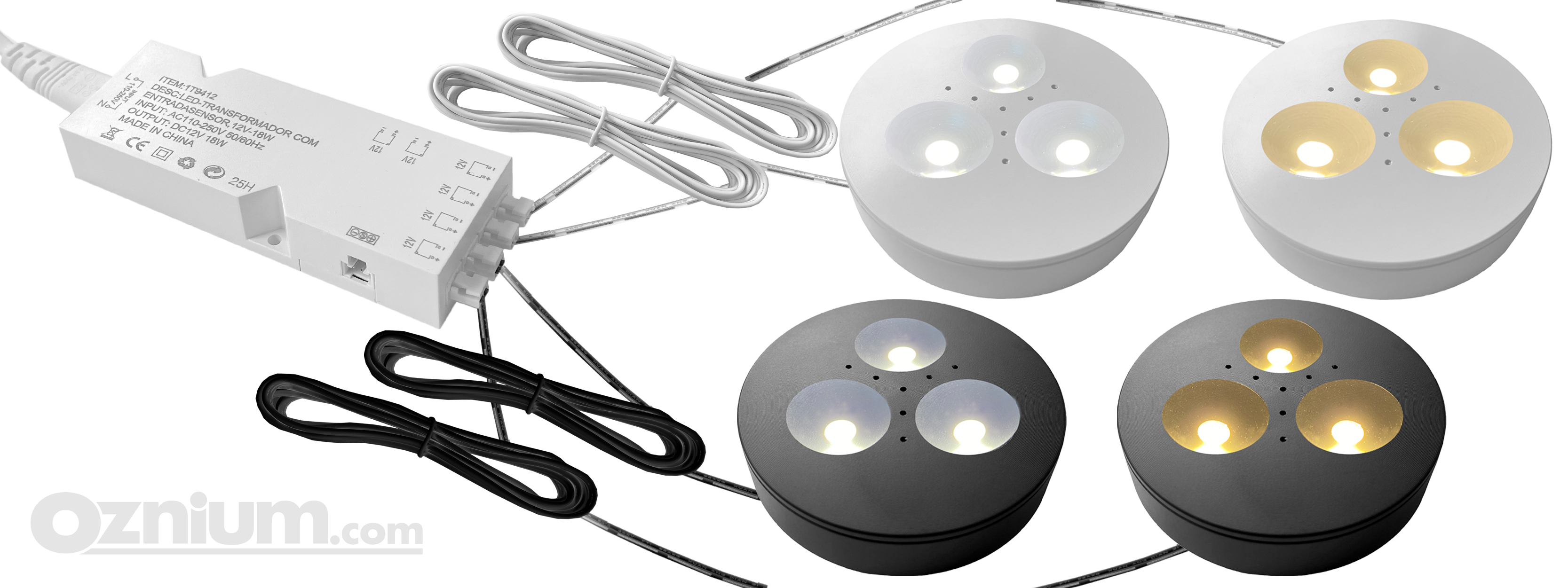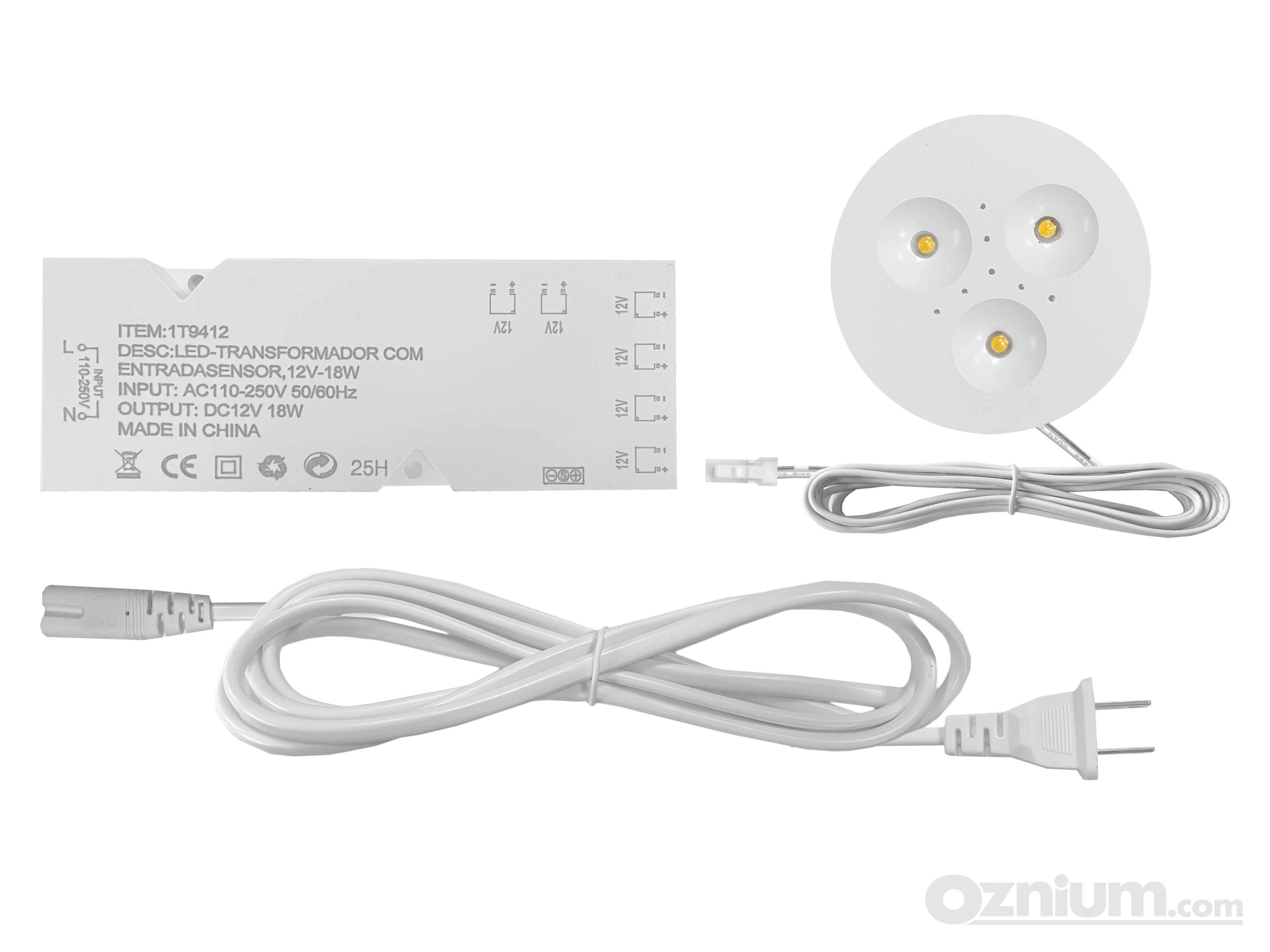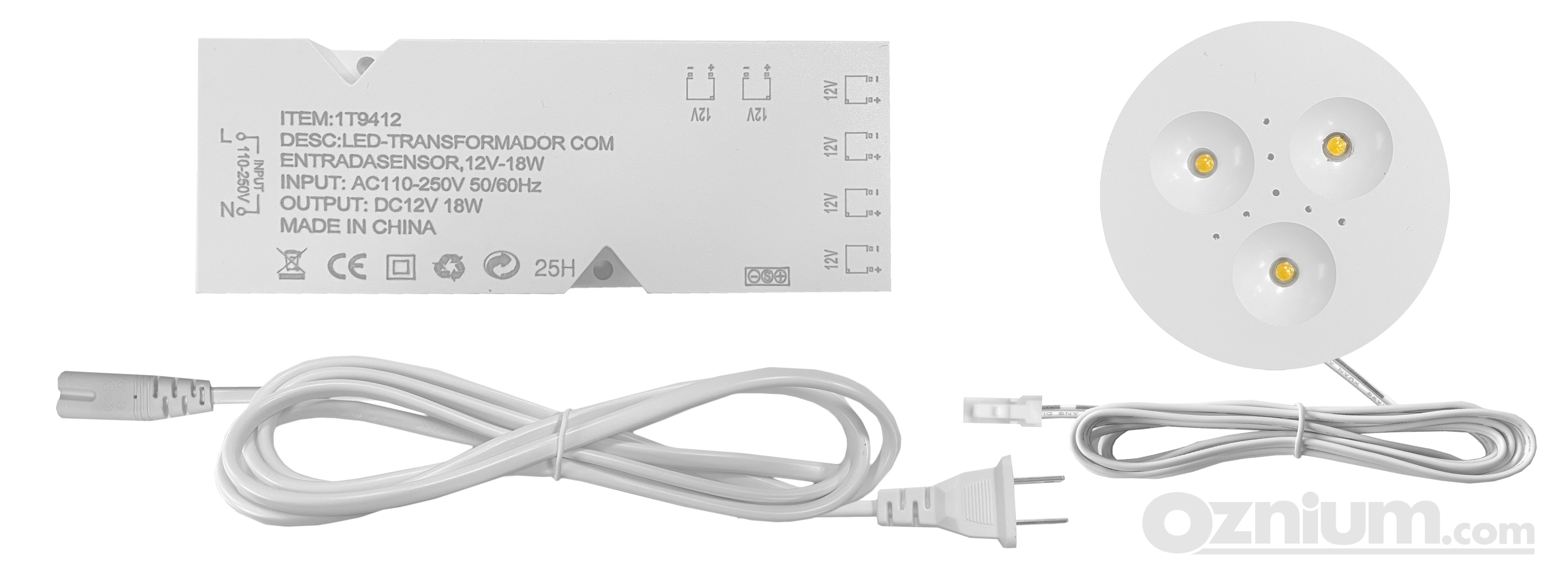 The LED cabinet lighting kit includes an AC-DC adapter with six ports for connecting the lights and a total power output of 18W. The adapter comes with a US plug, converting the voltage from 110VAC to 12VDC. Simply plug the AC-DC adapter into your home outlet, then connect the LED cabinet lights to the adapter. It is extremely user-friendly and safe for use under cabinets.