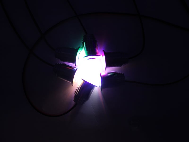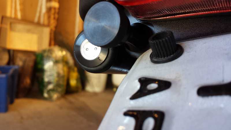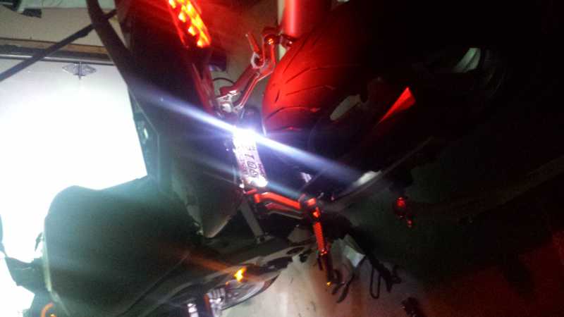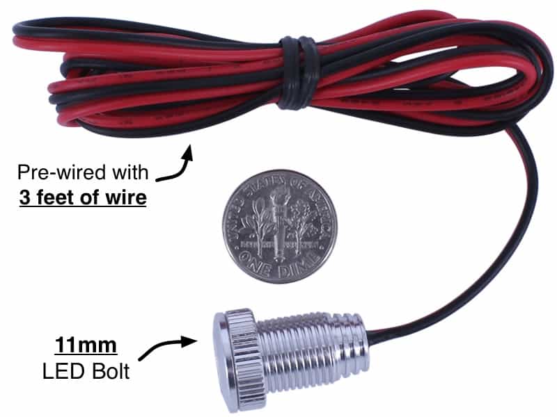 The red stainless steel 11mm 3W bolt is used as a center brake/running light that is always on when the bike is active. It's on a dual intensity circuit activated by a normally open optocoupler relay triggered by bike's 5V electric brake lever motor cutoff. Two 1W 11mm red bolts are used as rear running lights/brake lights activated by a wireless controller, also triggered by the 5V signal of the brake levers. The 3 red 11mm bolts are nice and bright.