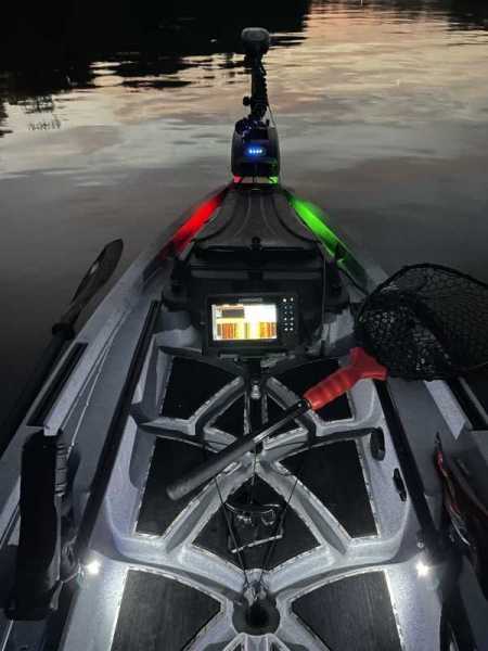 Often times I pre-fish a lake and map an area on my GPS and Sonar to fish. On tourney day I will navigate to that spot using waypoints I've saved in my system previously. Prior to the installation of my Oznium Bolt LEDs, I had surface mounted nav lights on the bow to the starboard side. This was the most logical spot as I have an anchor cleat mounted in the bow to the port side. The problem I had with the surface mounted navigation lights is glare. Being in a kayak you are much closer to all parts of your boat than you are in a larger boat with an outboard. The glare from these lights would affect my view of my GPS and after focusing my eyes on the GPS and overcoming the glare, when I would look up to make sure I wasn't steering my boat into a stump (or any of the various other obstacles you have to navigate around on a lake), I was blinded until my eyes adjusted to the lower light condition.