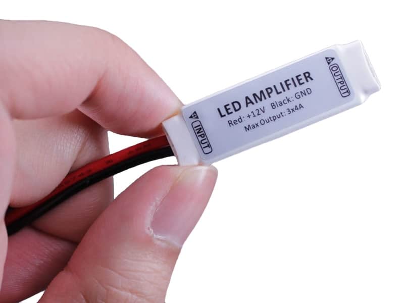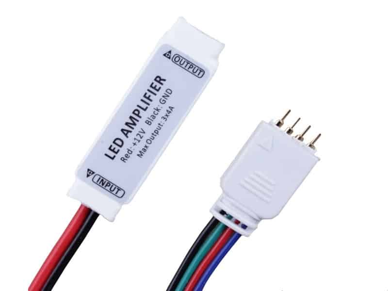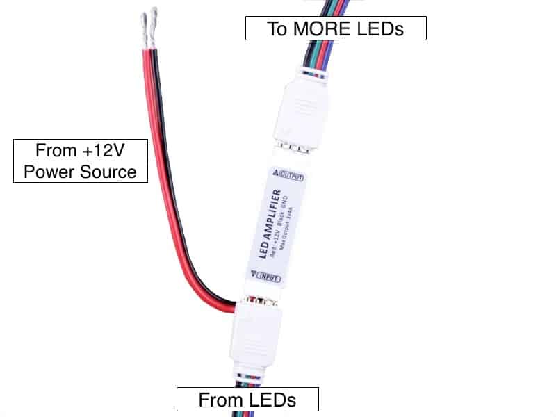 This Inline RGB LED Amplifier will take any PWM (pulse width modulation) signal, and amplify it, so you can power another 12 amps of LED strips.