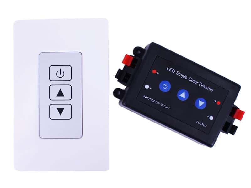 Installation couldn't be easier. Just connect your LED lights and a 12V (to 24V max) DC power to the RF dimmer and install the wall-mounted switch controller (battery of the controller is already provided). You can then switch on/off, and dim your lights right away!
