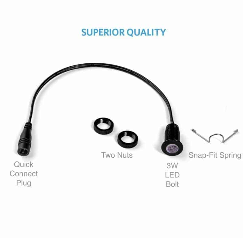 TWO MOUNTING OPTIONS: You can either use the snap-fit springs or the nuts. Both are included. The bright marine LED bolts sit flush in your boat for a discreet hidden appearance.